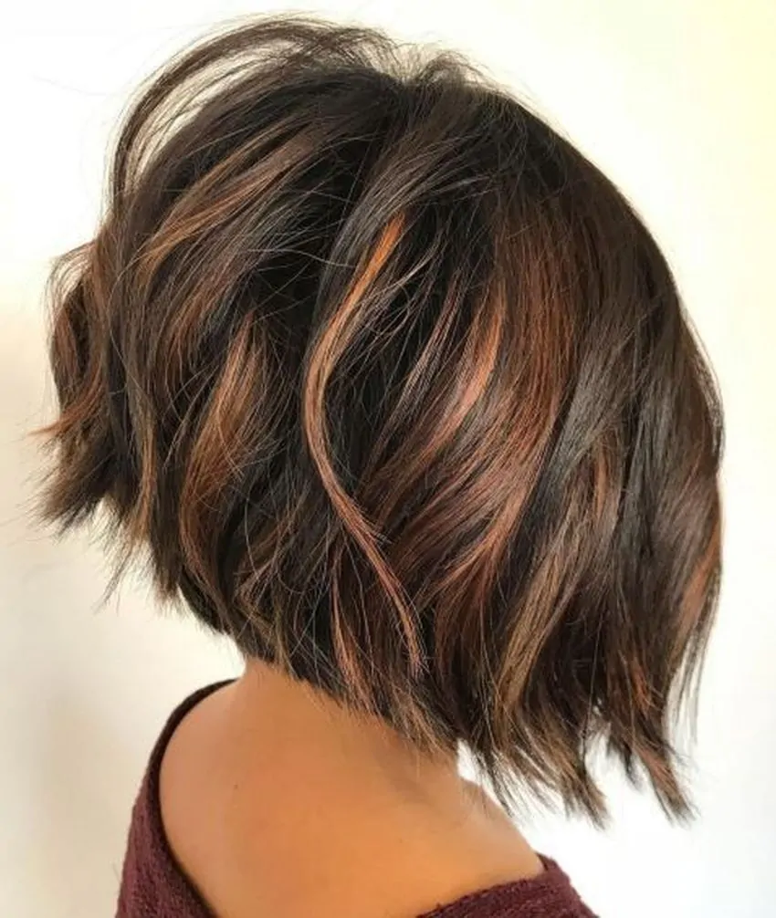 This shaggy layered bob is so much fun with its multi-tonal blend of chestnut brown and light auburn tones. The combined effect is a soft amber shade that is perfect for Fall. The light auburn shades will look stunning under the sunlight.