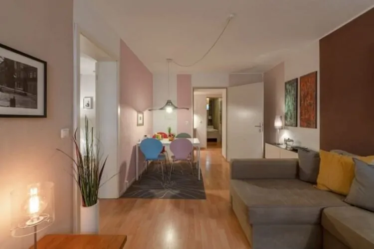 This one is a newly refurbished apartment with a wooden floor, designer couch, and a widescreen tv stationed in the large living room. A modern kitchen is fully equipped to suit one needs with baking and cooking appliances. It has a spacious bedroom with a stylish rug and plants for one to feel as if in a botanical garden. The most interesting is that this place offers lending books from the local library as a part of the accommodation. It is located near the river and the metro station is just a few minutes away.