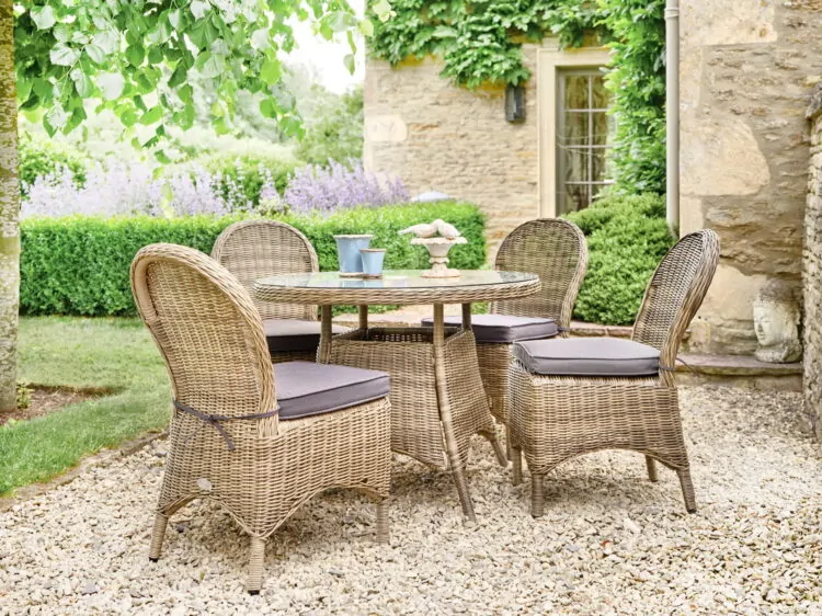 A consideration when using indoor furniture outdoors is potential scratches that may occur when dragged across the flooring of an outdoor seating area, such as patio slabs or decking. You can cap the legs of your tables and chairs with soft plastic to prevent damage, or simply place your furniture on top of a rug.